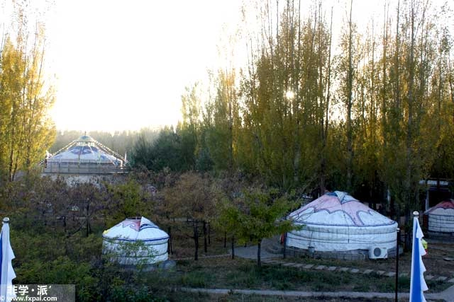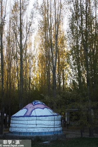 - 落日余晖映照在高大杨树的秋叶上,泛出淡淡的黄光。娇小的蒙古包躲在防风林的脚下,避免了尖利的寒风。