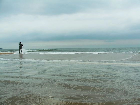 不知道在雨天下海游泳是不是一件比较疯狂的举动,不过既然来了,怎么舍得在海边看两眼就离开!看着半米多高的海浪不停地敲打着沙岸礁石,一股无名的冲动顿时抢占了理智的高地。我脱去了身上的束缚,只一件阿迪的泳裤遮羞,便三两步跑进了那片还没来得及冷却的海水中。浪花袭来,我与身旁的勇者们尖叫着大笑着被冲来冲去、上下起伏,完全不用刻意的去踩水和游动,只要浮在上面,就可以享受不停地刺激与精彩。也许这就是大自然的魅力,到了自然之中,没必要自己去寻找所谓的乐趣,只要你融入它,就能得到想要的一切。