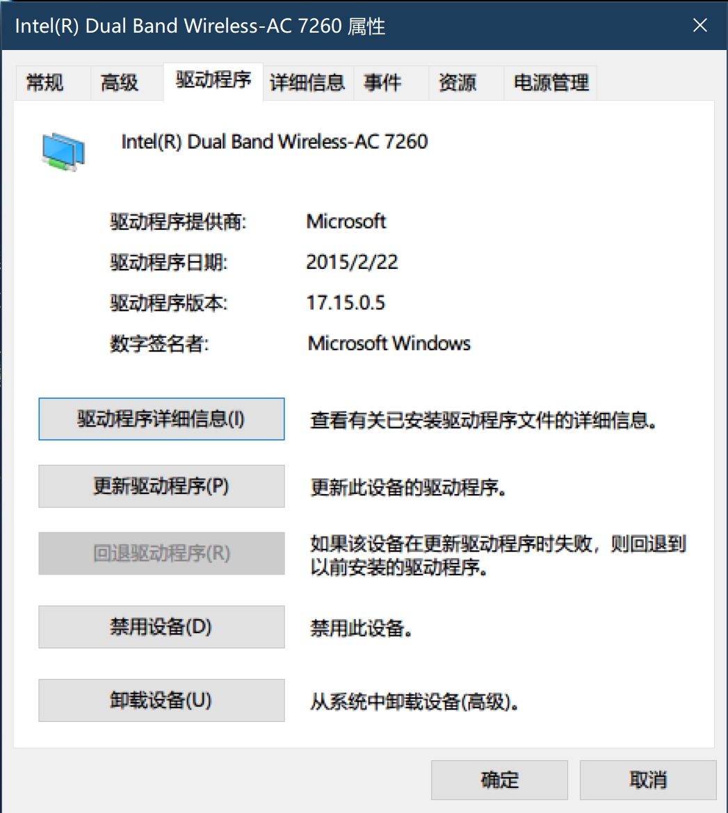 家里常备一台笔记本,网卡是AC7260,近一段时间突然发现搜不到家里的wifi信号了。起初以为是路由器问题,看了手机、IPAD等都正常。确定是笔记本网卡的问题,考虑到win10一贯的更新尿性,直接在设备管理器里的网卡驱动降级,一切恢复正常,好像降级了以后就不会再自动更新这个设备的驱动了。回退功能位置如图。